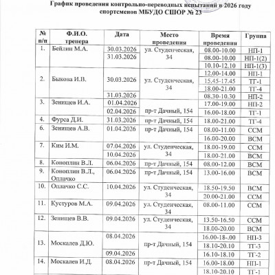 График проведения контрольно-переводных испытаний спортсменов МБУДО СШОР №23